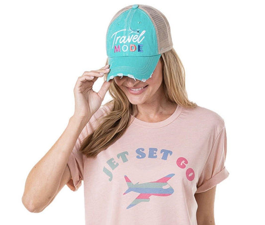 Travel hats TRAVEL MODE Embroidered distressed womens unisex trucker caps Airplane Trips Gray pink wine teal