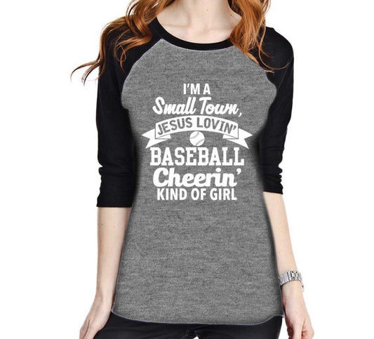 I’m a small town Jesus lovin baseball cheerin kind of girl shirt •• 3/4 sleeve raglan •• Red or black •• Women’s baseball clothing