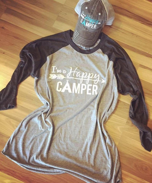 I’m a happy camper t-shirt •• 3/4 sleeve gray and black raglan •• XS - XL •• Camping shirts • Camp • RV