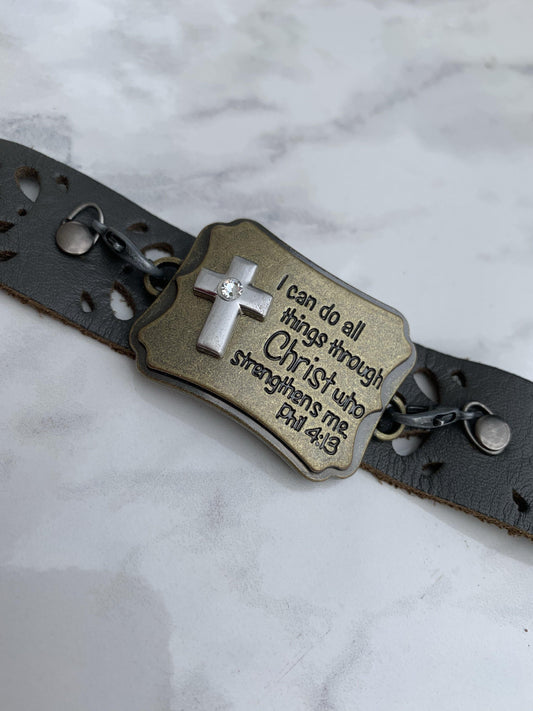 Bracelet | I can do all things through Christ who strengthens me Philippians 4:13 | Adjustable leather wrap