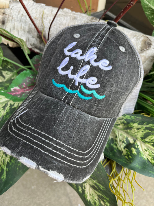 Lake hats Lake life Teal waves Gray embroidered trucker cap Boat Cabin Vacation