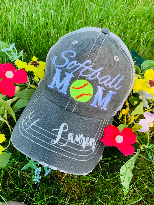 Softball hats Softball mom Softball hair dont care Embroidered gray distressed adjustable trucker caps Personalizable Softball forever