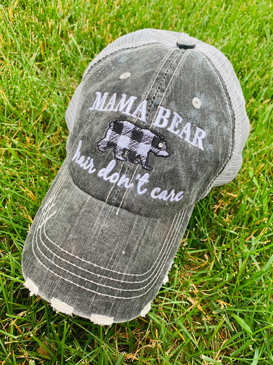 Hats { Mama bear hair dont care } Buffalo plaid, black/white bear • Trucker hat • Distressed • Mom hats •