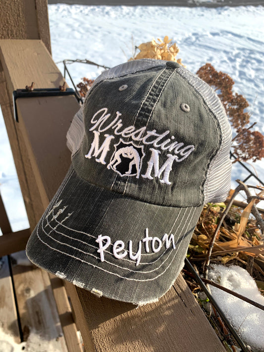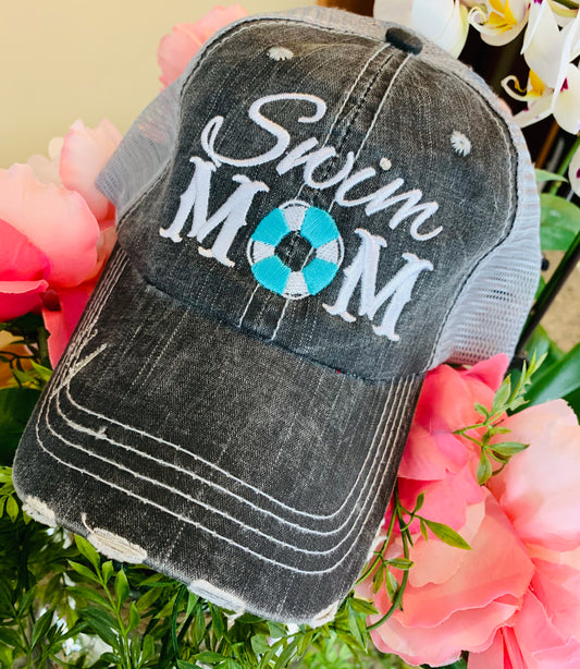 Swim hats Swim mom Swim hair dont care Embroidered distressed trucker caps Personalizable name number BLING