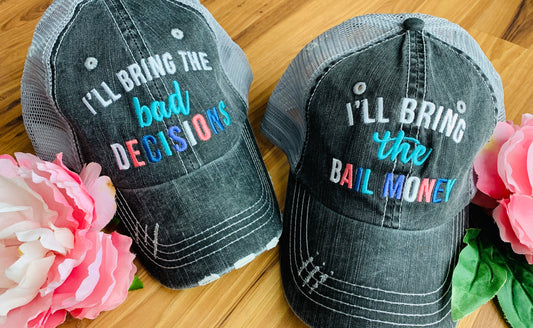Hats Ill bring the alcohol Bail money Bad decisions Gangsta rap Wine Essentials Embroidered Personalize