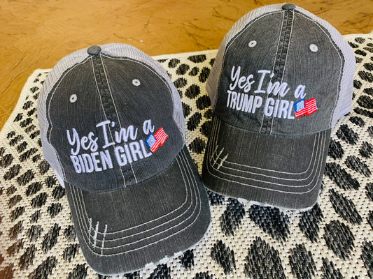 TRUMP hats Trump hair dont care YES I’m a Trump girl Yes American flag USA Embroidered unisex trucker caps mesh back adjustable womens mens Election Donald Trump