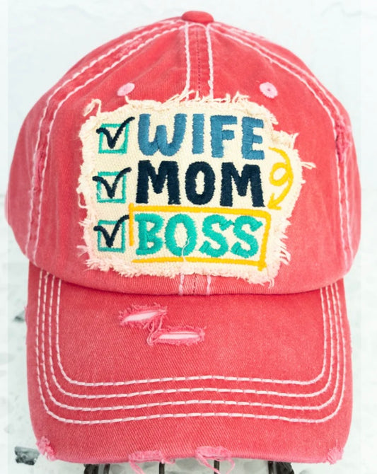Mom Wife Boss hat Salmon colored embroidered adjustable Womens pink orange cap