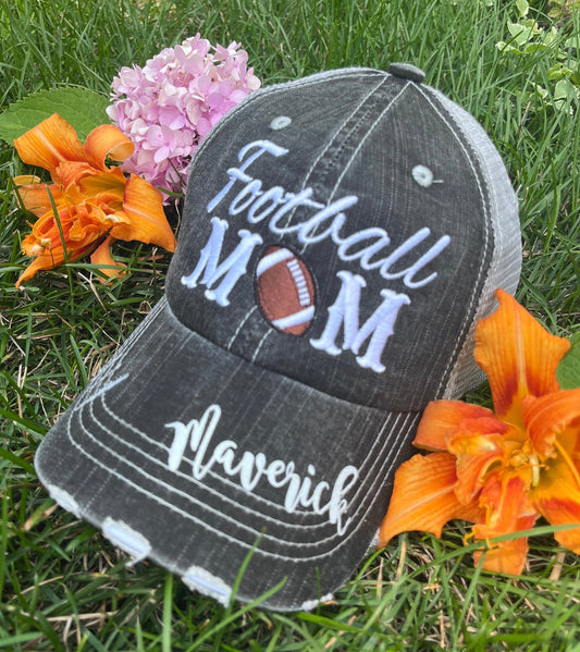 Personalized Football mom hat Add first or last name Gray embroidered distressed trucker cap Womens adjustable velkro mesh back low hole for pony Players sports game day