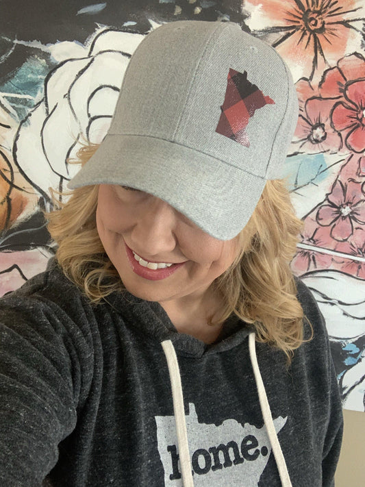Hat. Minnesota. Grown local. White hat with red and black buffalo plaid state. Adjustable. Unisex. Trucker cap. MN. Sota.