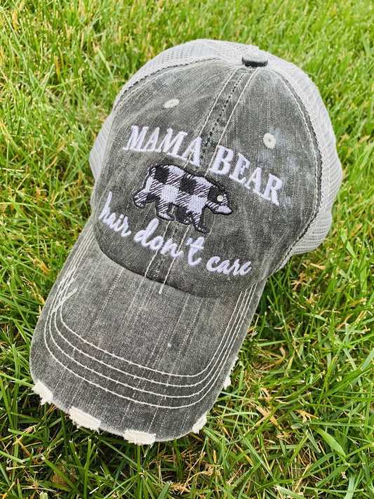 Hats, shirts, necklaces { Mama bear hair don't care. Gray with black and white buffalo plaid bear. Embroidered. Necklaces silver with option of bears. T-shirts XS - XL.