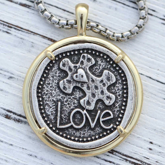 Necklace { Autism } Puzzle piece • Love • Silver and gold • 24 inch chain